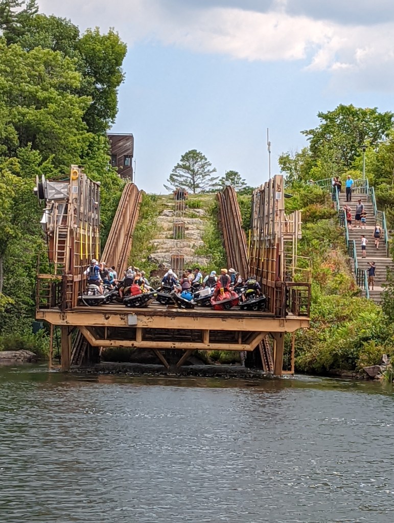 After we had gone through we tied up at a dock off to the side and walked back over to watch other boats go through. You really get more of a jarring view seeing it from land! After we got back on our boat and headed towards the last lock, a jet ski gang arrived to go up The Big Chute. I can only imagine what it was like on those lill water craft!