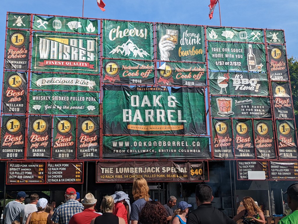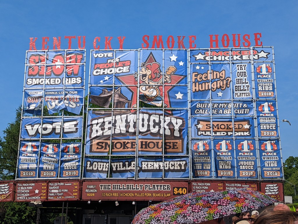 In the meantime we headed to rib fest. Which ended up being slightly misleading as there were only three places selling ribs. So we divided and conquered, each going to a different restaurant and each getting a half rack to share and compare. Don was excited to try the whiskey based sauce. Both were quite delicious but the place from Kentucky was slightly better, though the whiskey sauce was definitely tasty . I just couldn’t believe the size of their signs! There was also a fried onion booth so we brought one back with us.
