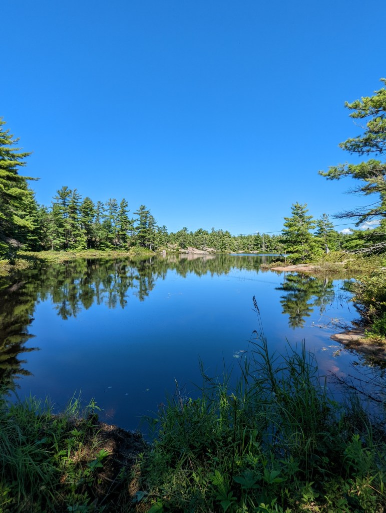 Each trail head was at a different spot along the island that had its own dock so we scooted over to another trail head that only had a very small dock with two boats already tied up. We decided to anchor out and take the dingy to shore. This hike was called Fairy Lake. So a lake on an island on a bigger lake ๐. This “trail” was very different. Open flat rock marked by poles that was somewhat hard to follow. Fairy Lake was very pretty though, and there was a small section on the back part of the looped trail that was through the trees and was nice.
