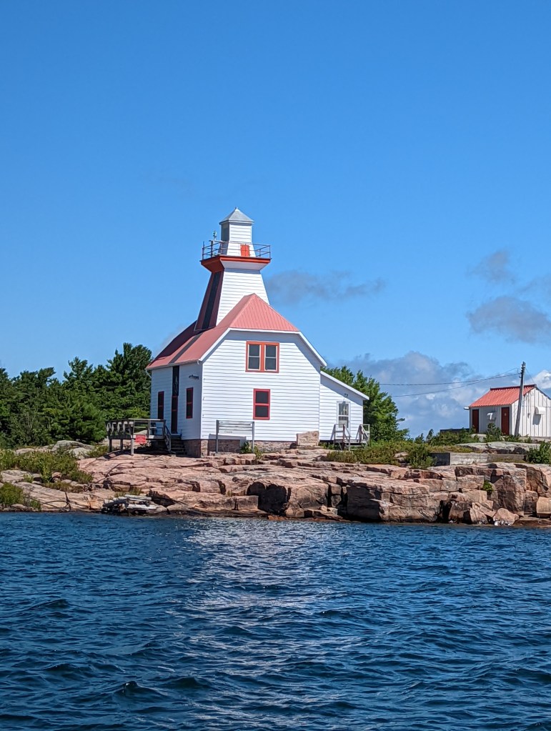 This morning the weather seemed to be better so we set off to check out another location further North still along the loop route. We came to Snug Harbor and found a good spot to anchor that was nice and calm. As we were coming in there was an actual lighthouse on the island edge.
