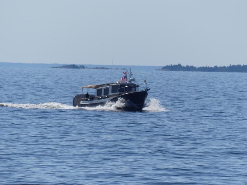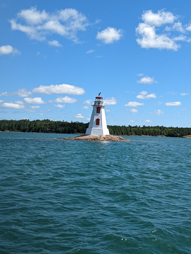 Wednesday morning we set off early to beat the winds to Thesselon. The bay was still pretty choppy, but we made it to the marina and got a slip for the night. Along the way we passed an island lighthouse, and New Adventure got some good pictures of us cruising along.