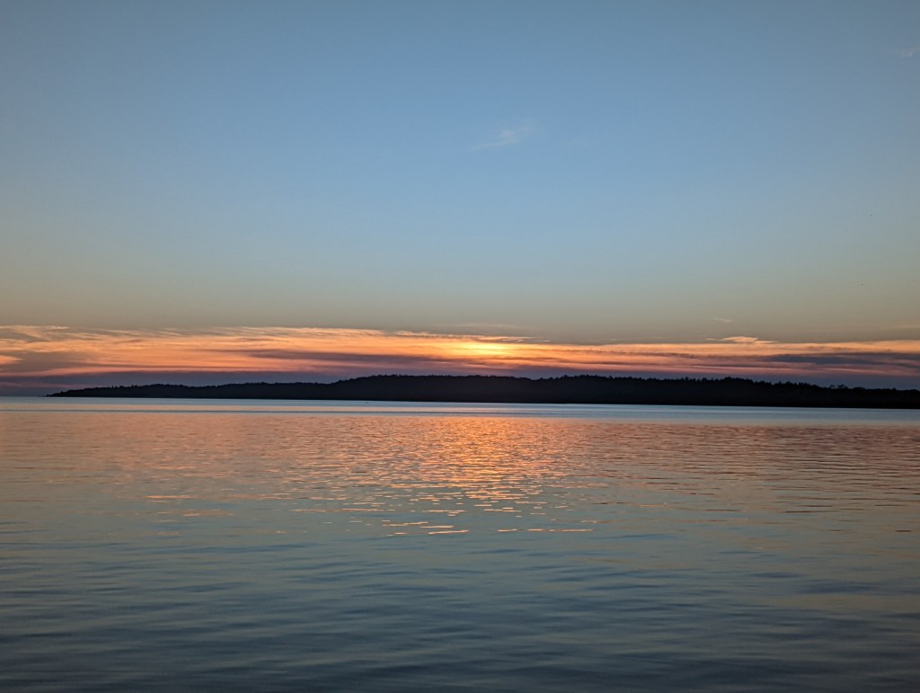 The boat Rival we had briefly met before was at the dock as well and they knew of a good anchorage nearby, so along with New Adventure, we followed them there. It was a pretty cove, but a little more exposed to the bay than the other’s we’ve been in. Luckily it was a fairly calm evening and the water was still. But VERY cold! Yet there was a rock just barely above water I just had to swim out to and do my best mermaid impression on.