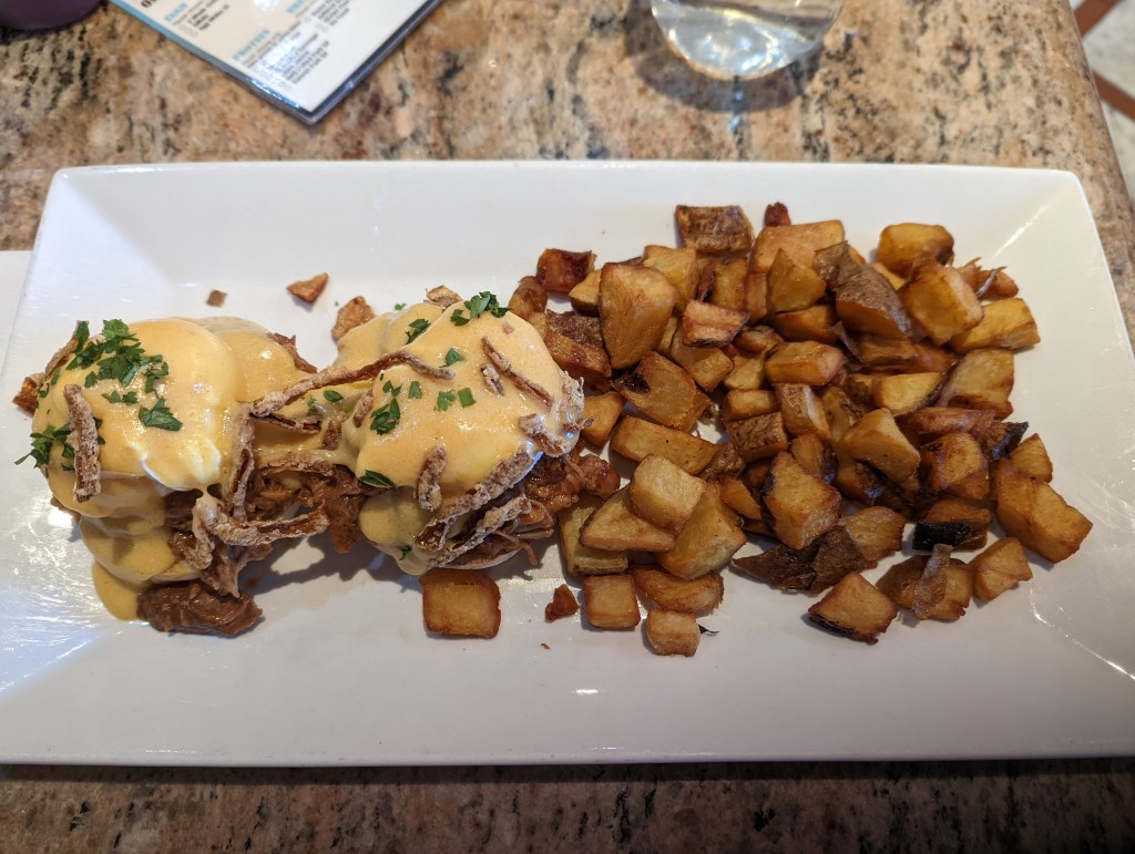 I had also saw on the map an intriguing looking restaurant called The Breakfast Pig. So this morning we went and checked it out. They had a lot of specialty items, including Pulled Pork Eggs Benedict on Sourdough. It was particularly yummy! The restaurant reminded us of The Country Cottage in North Tonawanda, which I call the pig place ๐ท๐. Decorations of pigs adorned the whole place.