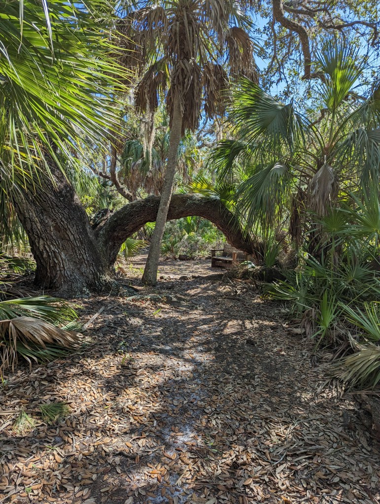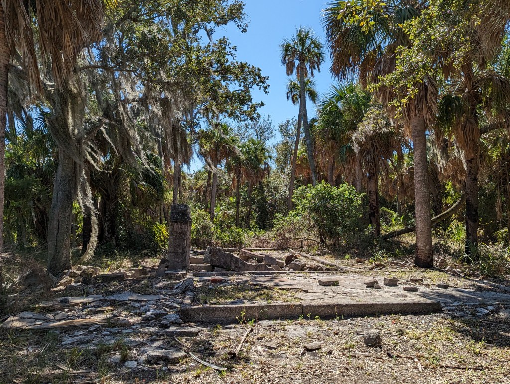 In the mid morning of Don’s birthday last Tuesday, we took a walk around the island and out to the old homestead ruins from the original settlers of the island. The walk was through very pretty, lush, palm forest.
