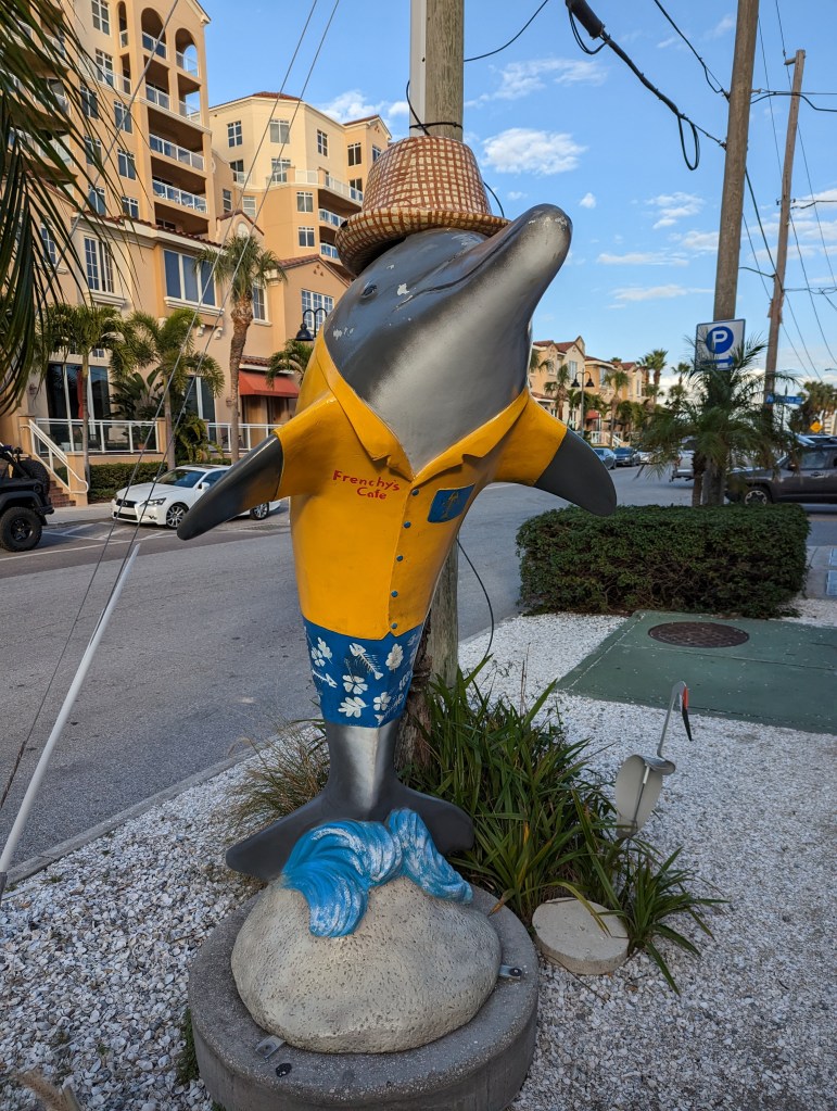 Thursday we got some danish from a local bakery, came back and did laundry in the hotel. Then it was down to the beach. In Buffalo there are bison statues all about decorated differently. Here in Florida there are the equivalent dolphin statue.