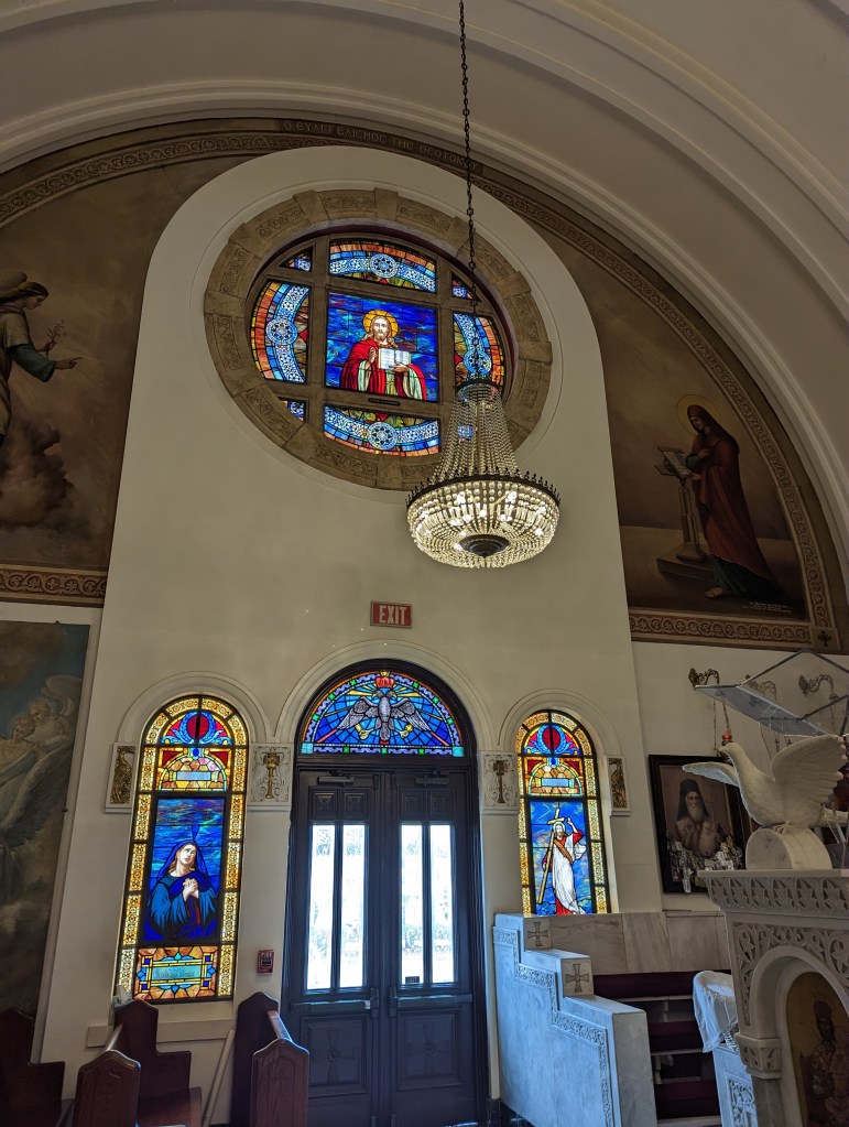 From there we hopped on the Jolley Trolley to Tarpon Springs. They are famous for deep sea sponge diving. The town was formed around the sponge harvesting industry by Greek Immigrants. Until the world expanded the only place sponges came from was the Mediterranean. When they were discovered in the Gulf of Mexico a group of sponge divers came over from Greece and set up shop. There is still a large Greek population today with many traditions carrying on. We went and checked out St. Nicholas Greek Orthodox Cathedral, very ornate stained glass work.